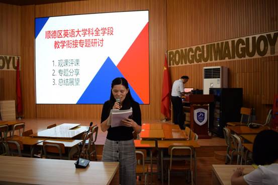 为了总结上学年英语学科大教研工作经验,研讨并部署新学期教研工作,积极推进区域联合教研,形成学科内学段衔接的大教研机制和各级各类教研合力,9月8日下午,本学期英语学科大教研工作会议于容桂外国语学校召开,顺德区教育发展中心教研员田湘军、杜晓曦、许莎莎,容外副校长周剑山,以及来自不同镇街和学校的英语科组长,各年级备课组长参加了会议。会议由容桂外国语学校英语科组长杨通兰主持。