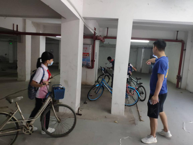(值日老师指引学生放好自行车)