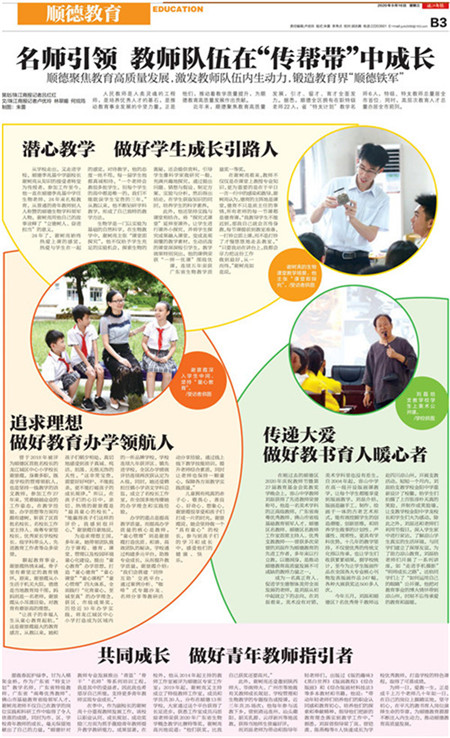 近日,在顺德区2020年庆祝教师节暨第27届教育基金会奖教奖学晚会上,我校教师刘磊获得了先进教师荣誉称号。昨日,珠江商报教育版报道了我校刘磊老师的教育事迹。