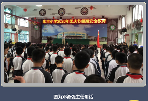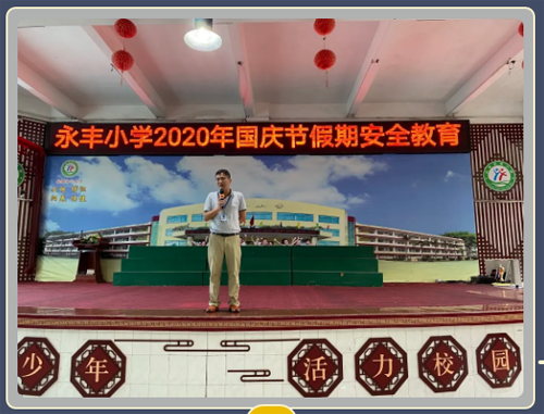 中秋、国庆两节即将到来,为了使全体师生过一个愉快而又安全的 “ 十一 ” 长假,严防安全事故发生,确保生命及财产安全。9月28日上午,永丰小学坚持预防为主的原则,开展了中秋及国庆节前安全教育。