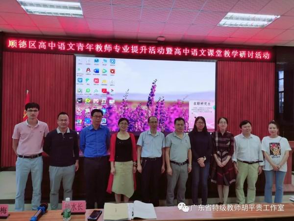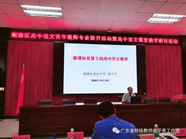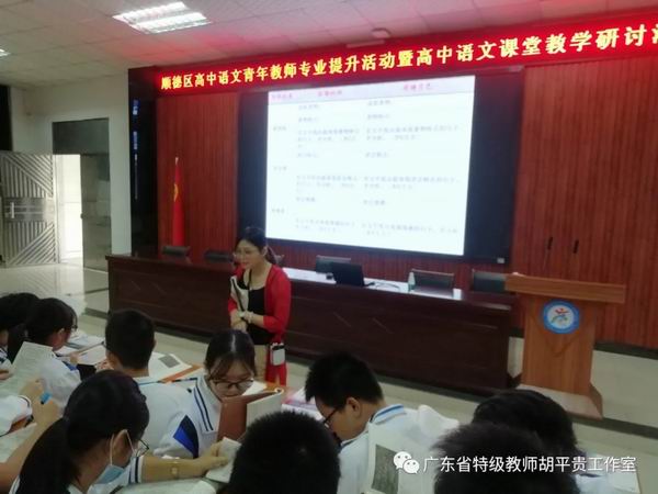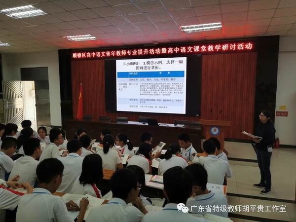 10月16日上午,由顺德区胡平贵特级教师工作室和广东省罗日明教师工作室联合举办的“顺德区高中语文青年教师专业提升活动暨高中语文课堂教学研讨活动”在杏坛中学顺利举行,两个工作室的部分成员以及顺德区高一、高二的一百多位语文教师参加了本次活动。
