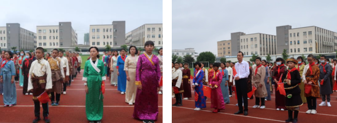 校园内红旗飘扬,肃穆庄严,升旗手身穿礼服,西藏班同学身着民族服装,在庄严的国歌声中,目送着鲜艳的五星红旗冉冉升起。