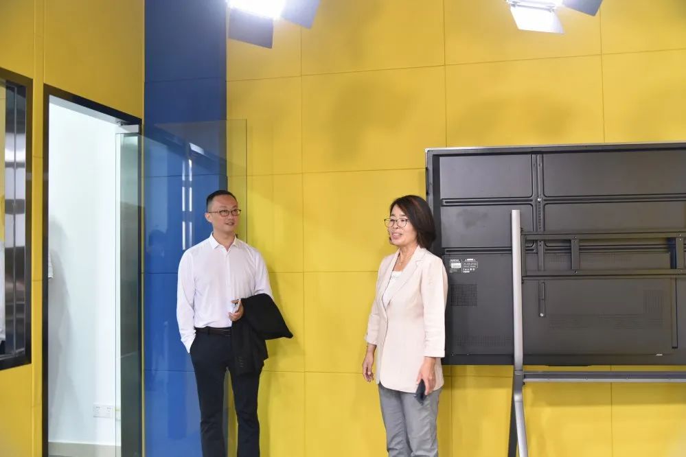 访问团一行到达目的地后,便在南沙区教育局教育管理科科长王敏、广州外国语学校附属学校校长刘梅、党支部书记潘小斌、副校长严明堂、王春强等的陪同下,先后参观了学校的宿舍、饭堂、物理实验室、外语情景室、图书馆、校园电视台等场室。