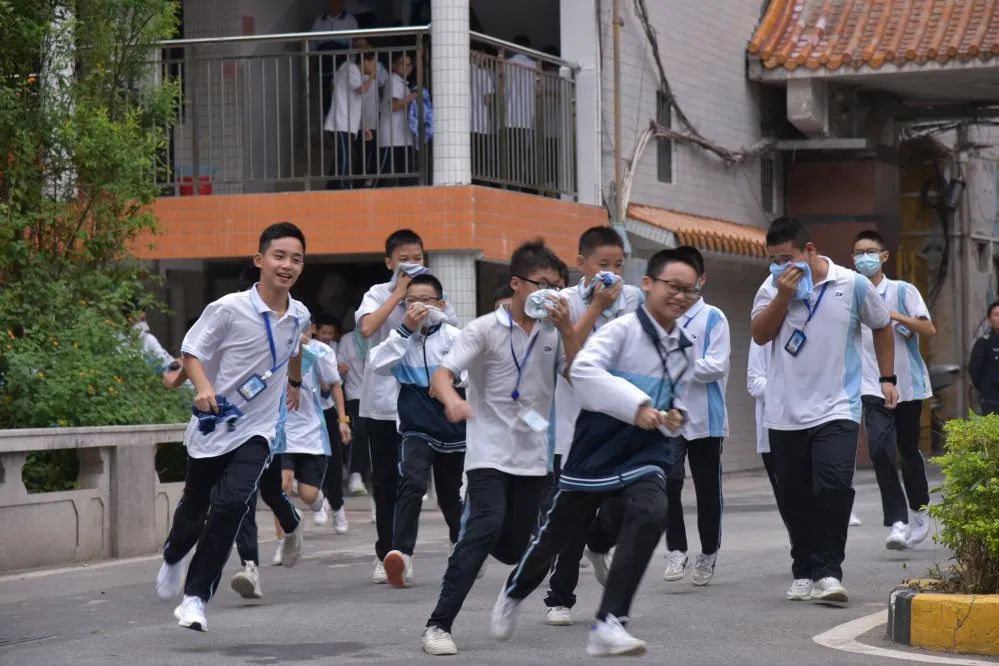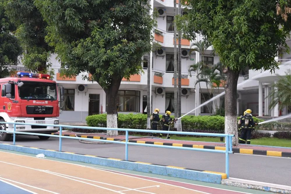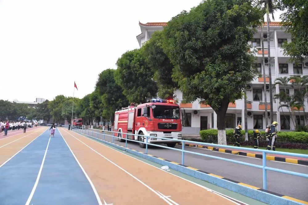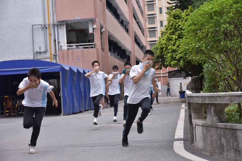 17:08分,短短4分38秒时间,全校两千余人分别从宿舍及教学楼安全疏散至运动场。同学们用湿毛巾捂着鼻子,模拟在真实火灾中避免吸入过多浓烟。各班班长清点本班人数并报告班主任,汇总至级长,确保学生一个也不能少。同时,消防车立刻赶往学校,模拟救火情况。