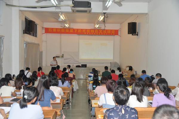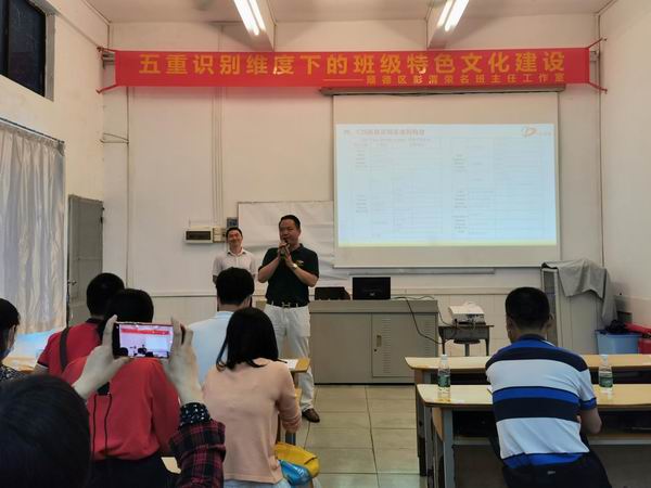 参观完毕后,顺德区名班主任工作室首席主持人彭渭荣副主任带来了主题为《五重识别维度下的班级特色文化建设》的精彩讲座。彭主任首先介绍了“一花七瓣”的学校一体化德育范式和年级文化体系,并重点介绍了他结合管理学知识和多年班主任经验创立的CIS班级识别系统,包括理念识别、行为识别、视觉识别、课程识别、公约识别五重维度。随后,彭主任介绍了冯爱娥老师的淇奥学堂、冯丽玲老师的繁星点点班、刘婷老师的寒梅班等具有代表性的班级文化建设成果,指出以上班级文化建设能够对学生提出合适的思想价值引领,彰显班主任的智慧,实现育人的最大效果。彭主任落地有声的经验分享,如熠熠星光,为大家指明了方向。在场的交流团和工作室成员、学员们听得入迷,认真记录笔记。