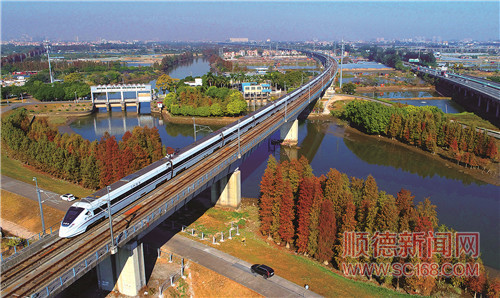 在河涌两旁金黄色的水杉树映衬下,一列高铁恍如进入黄金大道。