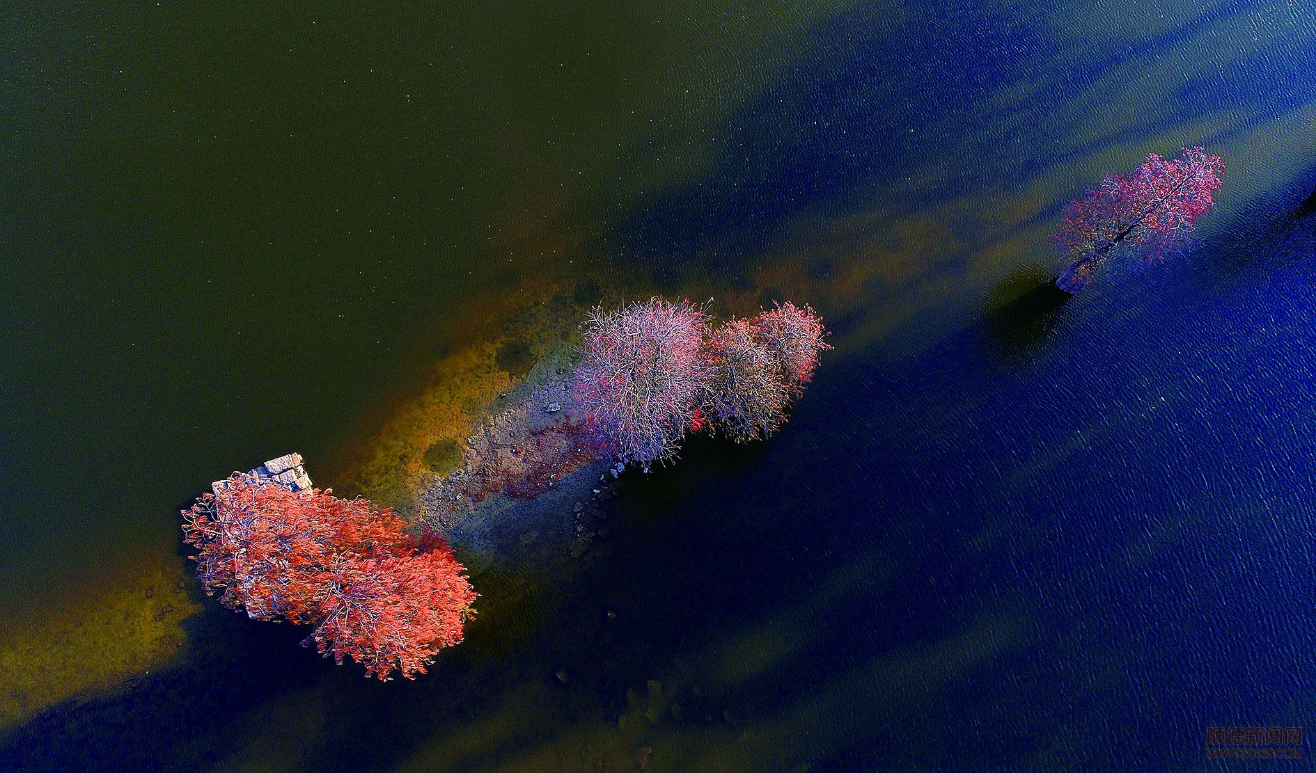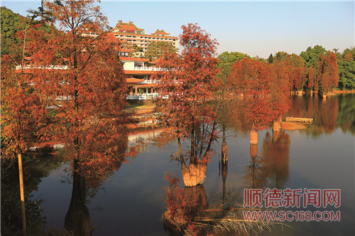 仙泉酒店湖面上大片金黄色水杉。
