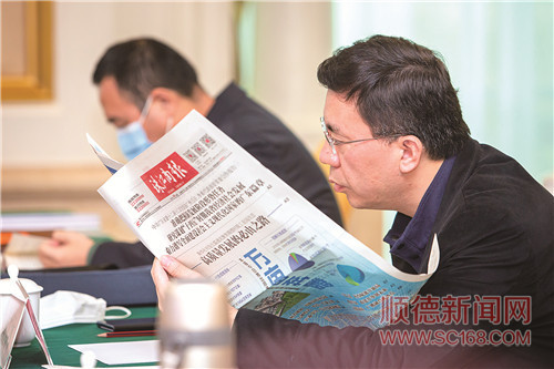 与会人员阅读《珠江商报》刊发的顺德区村级工业园改造专题内容。