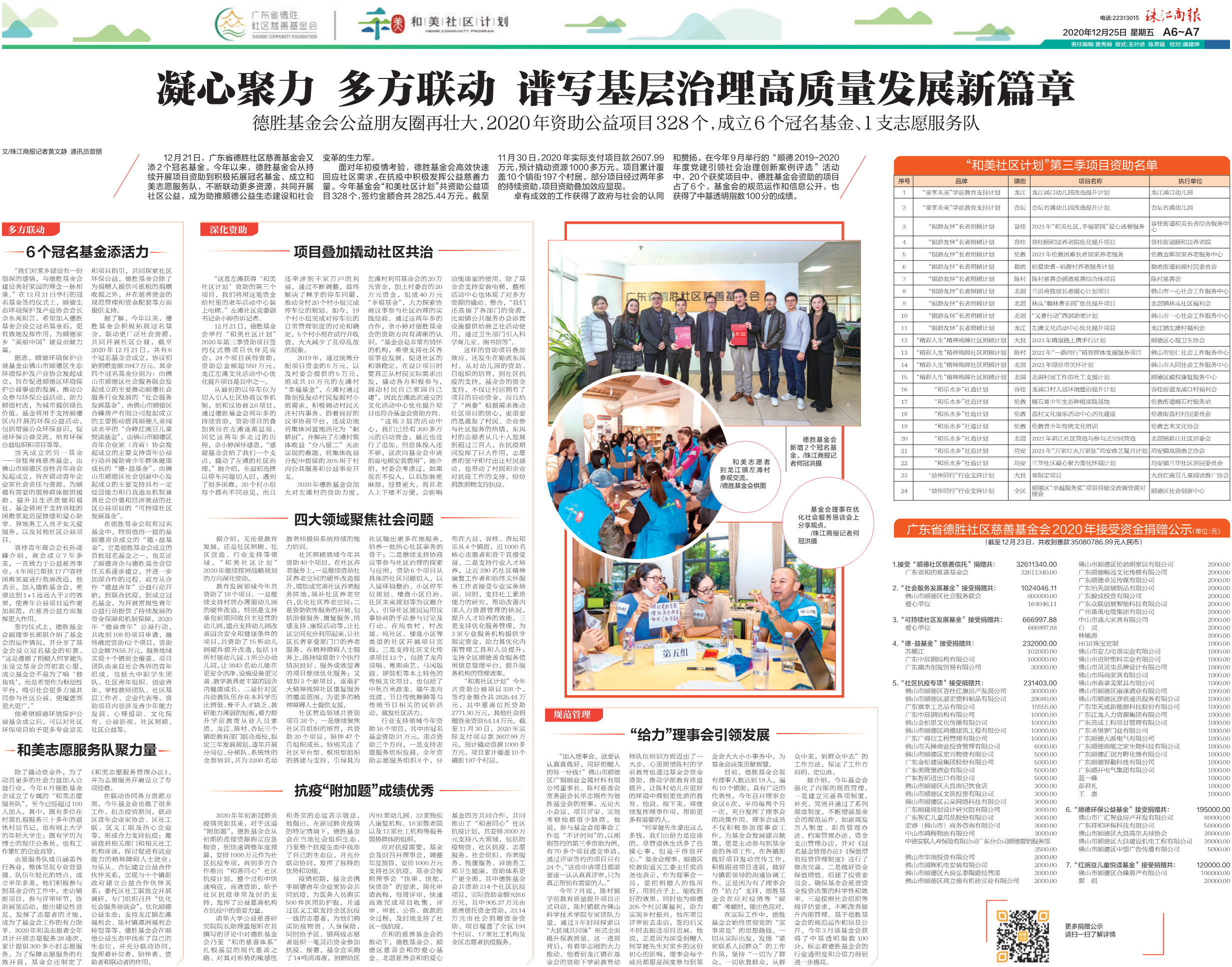 据了解,今年以来,德胜基金会积极拓展冠名基金,联动更广泛社会资源,共同开展社区公益,截至2020年12月21日,共有6个冠名基金会成立,协议初始捐赠金额294.7万元。其余四个冠名基金分别为:由佛山市顺德区社会服务联会发起成立的主要推动顺德社会服务行业发展的“社会服务发展基金”、由佛山市顺德区合峰房产有限公司发起成立的主要推动提高顺德儿童阅读水平的“合峰红豌豆儿童悦读基金”、由佛山市顺德区青年企业家(青商)协会发起成立的主要支持青年公益行动并援助青少年群体健康成长的“德·益基金”、由佛山市顺德区社会创新中心发起成立的主要支持具有一定经营能力和自我造血机制兼具社会价值和经济效益的社区公益项目的“可持续社区发展基金”。