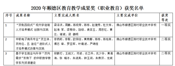 学校获2020年顺德区教育教学成果奖(职业教育)一等奖1项、二等奖2项。“双轨四段式”现代学徒制人才培养模式创新与实践荣获一等奖,中职电子商务专业“双主体、双岗位、五途径”进阶式人才培养模式改革与实践、基于学生就业与升学“双向需求”形势下的中职数学教学系列资源建设分获二等奖。