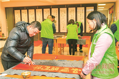 书画爱好者们挥毫写春联,为困难家庭送温暖。