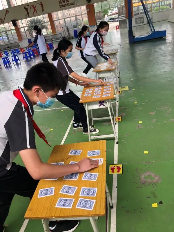 第二个活动是翻牌活动。经过分组,全班同学分成4组,每组同学排成一队,逐个上前翻牌,一次只能翻一张牌,组员们需要将牌面是1-K的扑克牌按顺序翻出,率先完成的小组为胜。