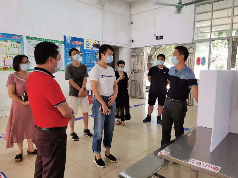 在均安中心小学焦柏强校长的陪同下,检查组先后深入学校心理室、饭堂、教室等场所,实地查看了校园环境卫生、卫生消毒等工作的落实情况,详细询问了有关疫情防控的措施和开学工作的准备情况。曾镇长特别关注了解了学生心理健康、出行跟踪以及饭堂配餐情况,确保学生健康、安全迎接新学期。