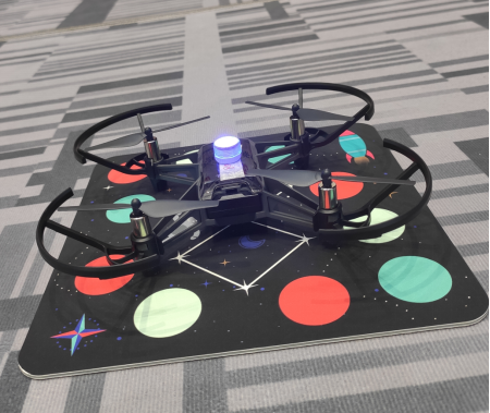 这次人机协同表演,利用8架大疆Tello EDU 无人机编队,运用其视觉和深度学习等前沿科技,控制Tell EDU,实现物体识别,目标跟踪,三维重建等AI应用。通过编写程序,控制着8台Tello EDU在”挑战卡”上编队飞行,做出精彩的表演,用代码指挥飞行器配合同学们做出漂亮动作。