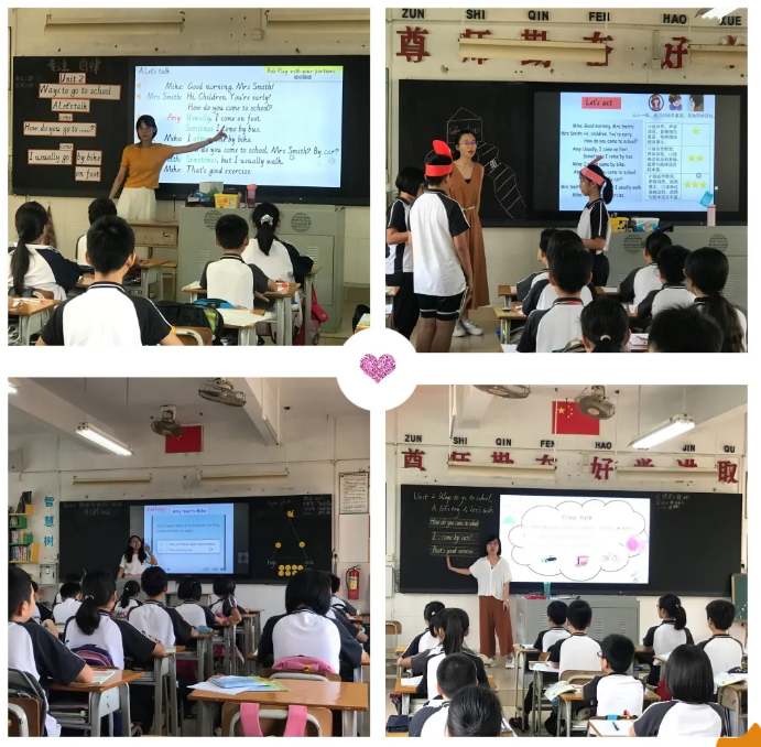 90后的老师同课异构的内容是PEP人教版六年级上册Unit 2 Ways to go to school A Let’s try & Let’s talk对话课,各个老师用流利的口语拉开帷幕,首先利用音乐导入课程,引导学生观察图片,猜测人物活动,引出难点单词和重点句型。教学活动的设计丰富多彩,训练方式多样,有全班活动、师生互动、小组活动、双人活动、个人展示等,在活动中突破难点,在活动中发展能力。
