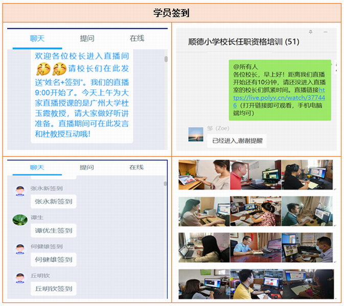 本次直播活动采用线上签到和线下拍照相结合的签到方式,并做好开播前提醒和直播中监控工作,确保全体学员参与直播活动。