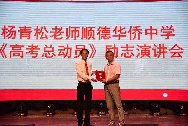 顺德华侨中学校长吴剑平为杨青松老师颁发纪念证书