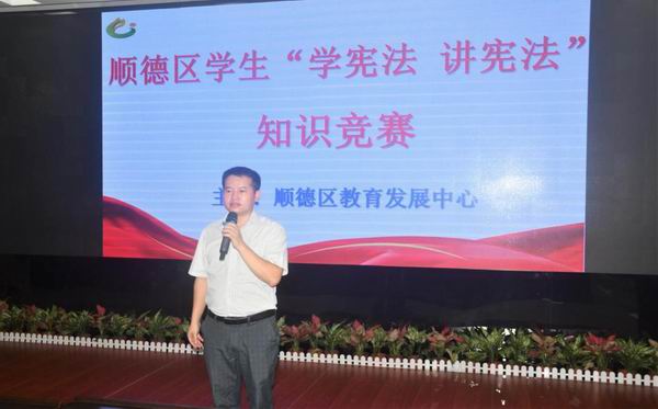 为进一步在青少年学生中普及宪法知识、弘扬宪法精神,引导青少年学生自觉成为宪法的忠实崇尚者、自觉遵守者,2020年9月4日,顺德区学生“学宪法讲宪法”法治知识竞赛于顺德区教育发展中心一楼多媒体室举行。