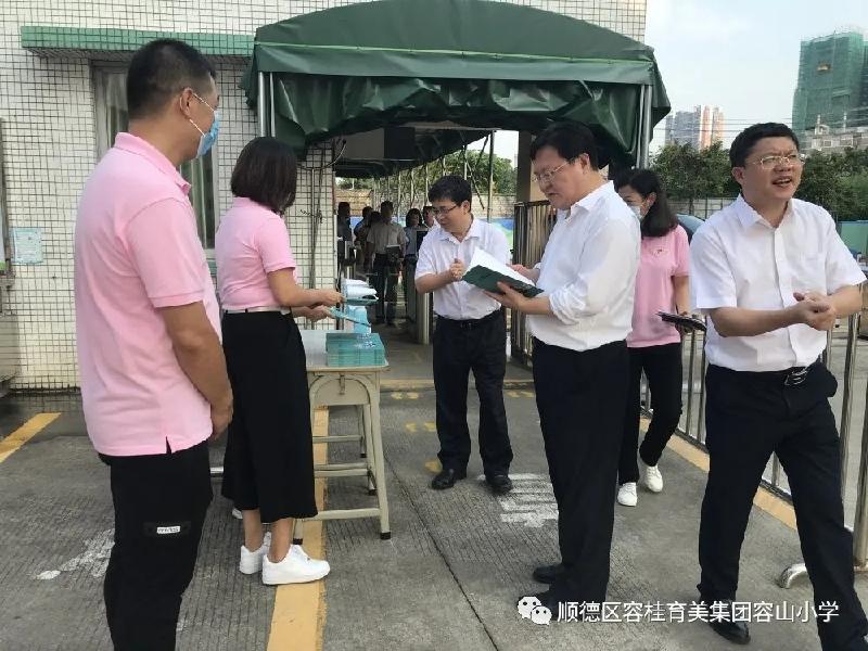 2020年8月31日下午,佛山市副市长许国、佛山市政府副秘书长邓灿荣等一行人带队到顺德区容桂育美教育集团容山小学开展秋季返学工作检查督导。顺德区副区长蔡伟,顺德区教育局党组书记陈宇莹,容桂街道党工委副书记、办事处主任欧胜军,容桂街道党工委委员欧阳雪乔一行以及容山小学赵源颖校长陪同察看校园。