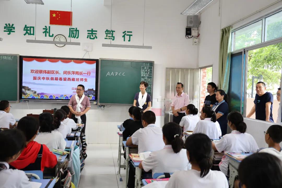 10月5日,顺德区副区长蔡伟同志在顺德区教育局闵乐萍局长的陪同下亲临江义中学慰问西藏班师生。胡和秋校长、周霞副校长、刘启文副书记等学校行政领导陪同。