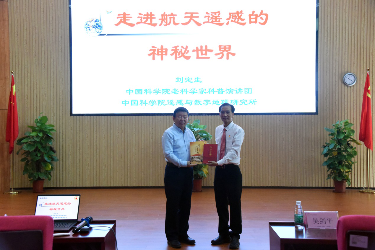 参观过后,刘定生教授在大家的陪同下来到了我校的崇善报告厅,正式开始科普希望行专题活动。本次活动由学校教学科研处潘锦江主任主持,首先潘主任代表华侨中学的全体师生,对中科院刘教授、市科协李主任、区科协黄主任的到来表示热烈的欢迎,表达了师生们对科学讲座的热切渴望。接着,潘主任又向师生们介绍了刘定生教授,以及讲座的课题为“走进航天遥感的神秘世界”。