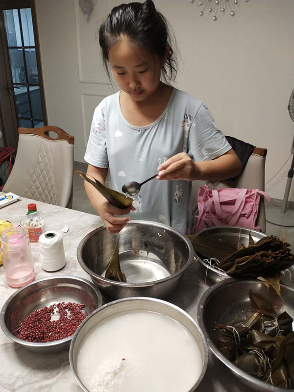 各班还给孩子们布置假期作业,孩子们利用假期在家里学习家人包粽子,了解粽子的种类,还用五彩的画笔在图画纸上画出精美的粽子。