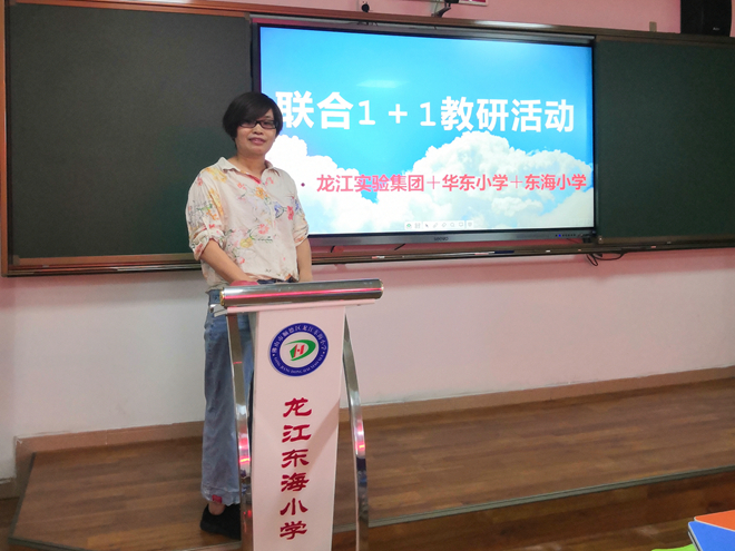 6月19日早上,龙江实验集团华东小学与东海小学联合1+1教研活动在东海小学阶梯室举行。