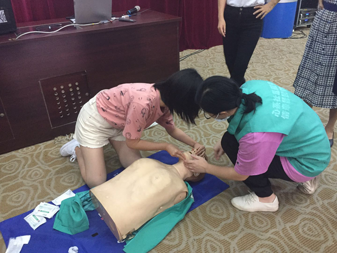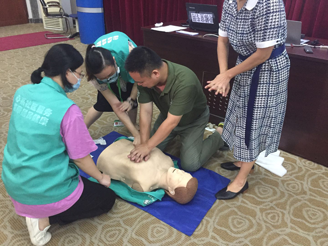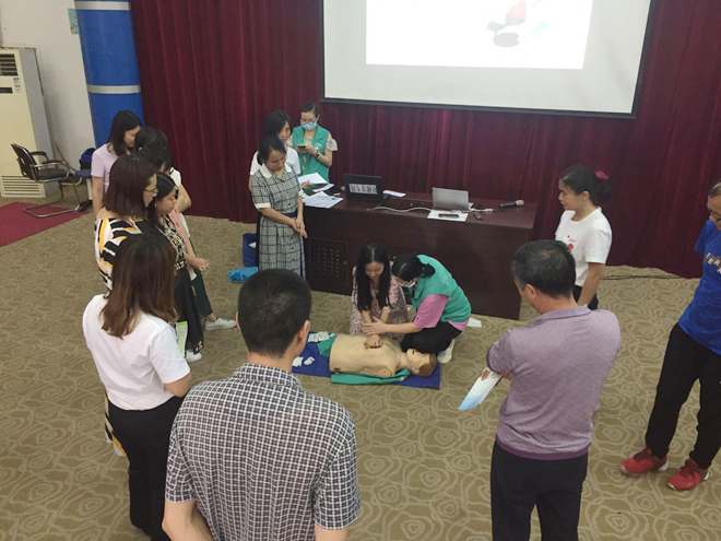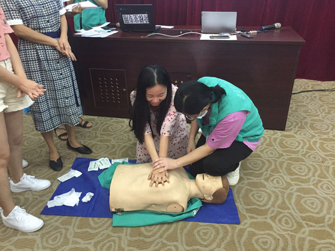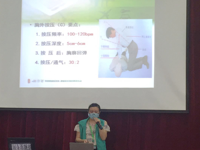 本次知识讲座分为理论知识讲解和实际操作两部分,张医生采用PPT形式,从心跳呼吸骤停可发生的场所、个体、心肺复苏概念、黄金救命时间等方面做了详细的介绍,同时结合不同伤情下应采取的不同急救措施,对心肺复苏各环节技术和流程进行了现场示范。