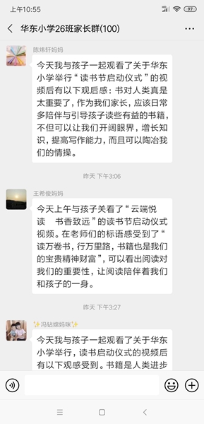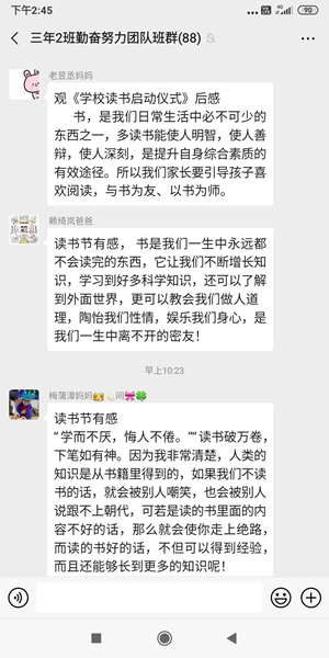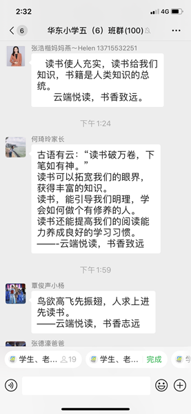 恰逢今天是五、六年级学生返校,于是本次活动分线下和线上钉钉直播两部分进行。首先,由龙家怡老师向五、六年级全体师生介绍本次活动的意义和介绍读书节启动仪式活动流程。其次,由叶丽燕副校长详细解读本学期读书节活动方案。然后,学生们观看读书节启动仪式视频并撰写观后感。一到四年级的读书节启动仪式在钉钉班群上也同时进行。班主任通过直播向学生、家长介绍了本次云端读书节活动,对学生的阅读方法进行指导后,观看读书节启动仪式视频。视频中,龙江镇教育局教研专干陈金梅、龙江镇教育局德育专干和专职责任督学刘自力、李耀宗校长、各行政干部、骨干教师代表、家长和学生代表通过引用关于“读书”的名人名言,号召全体师生多读书,读好书,积极参与到读书节的各项活动中去。在看完了读书节启动仪式视频后,同学和家长纷纷表示:视频拍得太好了,让人深深陶醉在书香中。六(4)班彭诚真同学在观后感里面写到:书籍,可以滋养星空体育的灵魂。让星空体育与书相伴,幸福成长。二(6)班刘雅婷家长说:为华东小学的读书节点赞!让读书成为一种时尚,让学习成为一种习惯。读万卷书,行万里路!