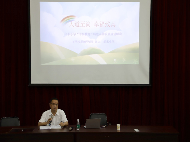 《学校品牌管理》杂志的谢老师从学校发展背景出发,以战略的高度解读了缔造“幸福教育”的缘由、涵义、精神文化系统、课程体系,升华了“幸福教育”的理论依据和指导思想;再对校园文化、课堂教学、幸福教育的活动和教师队伍建设等方面进行了具体方法的阐述;最后进行了华东小学幸福教育顶层设计系统的解读。