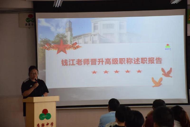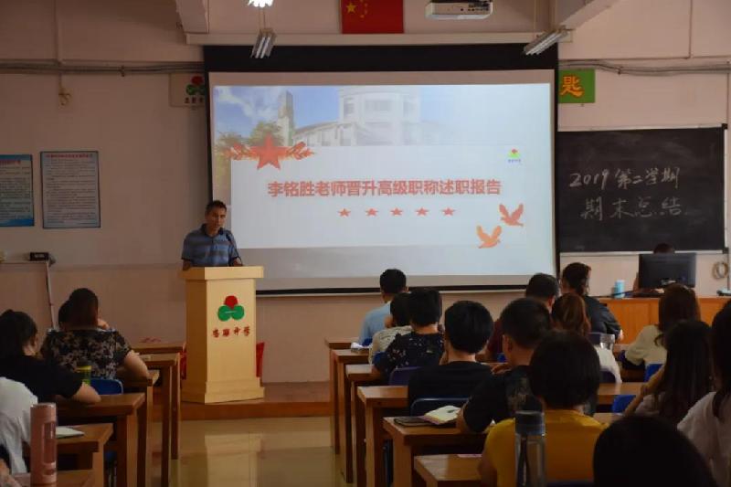 2019学年第二学期期末总结大会由钱江副校长主持,大会分为三个流程。一是十位申报晋升高级职称的教师进行述职报告;二是赵平正校长发言并公布下学期的教学分工安排;三是表彰大会。