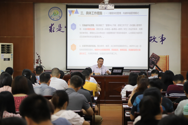 随后,学校领导班子成员分别就学校教学、德育、特色社团等各项工作做了重要讲话。叶丽燕副校长主要从管理、教科研和书香校园建设活动三大方面对新学期教学教研工作进行部署,希望我校教学成绩更上一层楼。何慧荣副校长主要从教育理念、德育队伍建设、学生干部队伍建设、家校联系、养成教育和校园文化方面对新学期德育工作进行安排,希望良好的德育能为学生锦上添花。廖槟强书记则从学校特色社团方面展开布置,希望新学期我校特色社团更加灿烂多姿。伍其印主任和严冬花主任分别从教师纪律和安全方面做出要求,保障学校在教育教学期间安全有序。
