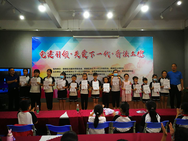 图为:“千人书画大赛”会议室分场谭校、何主任对学生进行颁奖