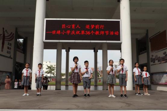 接下来,,世埠小学八名学生代表上台向全体教师献词。耕耘密无痕,润物细无声,他们用满怀感恩的声音向所有教师献上节日的祝福。伴随着阵阵感动,罗校长为获得2019学年学校优秀班主任、优秀副班主任的老师们颁奖,勉励获得表彰的老师充分发挥示范带动作用,激励全体教师奋发向上,勇当先进。