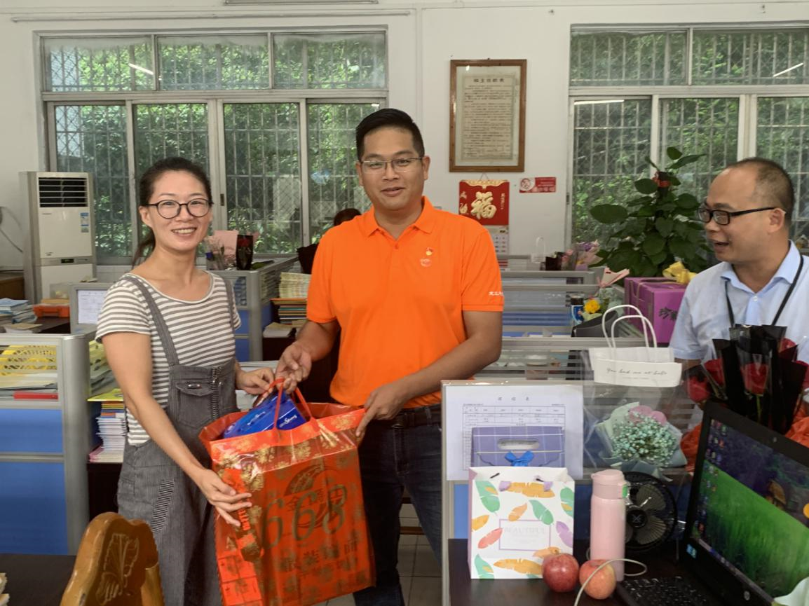 学校的热心家委们在会长的带领下自发组织了一场赠旗慰问仪式,为老师们送去鲜花和祝福,感谢老师们一直以来的辛勤耕耘。赠旗仪式上,家委会会长代表家长们向邱校长赠与了感谢锦旗,随后家委代表们手捧鲜花,送到办公室老师们的手上以示感恩之情。