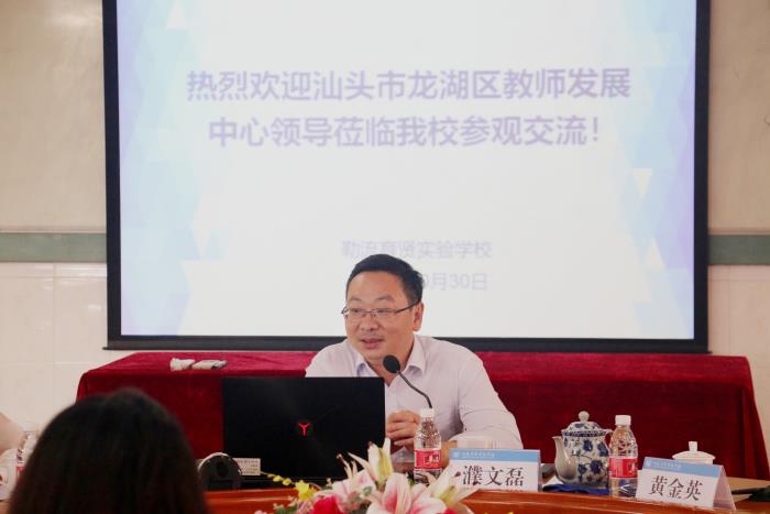 参观完校园后,在二楼会议室开展座谈会,会议由吴海坚副主任主持。会上,濮文磊校长对汕头市龙湖区教师发展中心领导专家一行的来访表示热烈的欢迎。与会人员一同观看了学校宣传片,使他们对学校文化建设有更深的了解。濮文磊校长对学校的发展历程、办学理念、办学特色以及学校一体化发展作了简要的汇报。