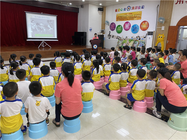 中班级长根据幼儿年龄特点,利用多媒体课件、图片、故事、儿歌等形式,让幼儿了解易发生溺水事故的危险地带,分析如何避免溺水、如何自救的相关安全知识。其次,结合实际情况创设情境进行求救、互救的防溺水实践演练,保健医生现场示范了溺水施救、人工呼吸、心肺复苏等动作要领。最后,级长做了防溺水应急演练总结性发言,让幼儿明白了不能在没有家人陪同的情况下擅自游泳,懂得珍爱生命的意义。