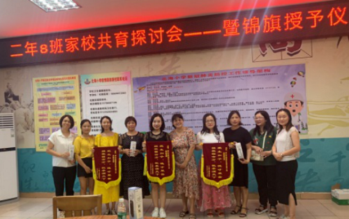 二年8班家委和家长代表给何敏玲老师、廖婷老师、潘味芳老师授旗