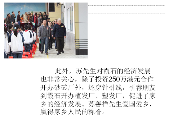 班会课上,同学们了解到善祥先生是一位乐善好施、受人尊敬的企业家,多年来一直为家乡建设与教育事业作出巨大的贡献。多年来,他共捐赠港币300多万元支持家乡建设。为了促进家乡的经济发展,他不仅投资250万港元合作开办砂砖厂,还穿针引线,引荐身旁朋友到霞石投资设厂;为了敬老尊老,他兴建敬老院,并每年牵头发动霞石在外的乡亲筹集经费,举行每年一度的敬老大会;为了发展教育,他投资兴建了霞石善祥学校和霞石幼儿园,举办奖教奖学大会,奖励认真读书的学生和勤奋的老师们,关注霞石学子的成长。这位可爱的老人对家乡的感情深厚,总是想方设法地为乡亲们做着一件件力所能及的事情,他无私的大爱,赢得了村民对他的敬佩和赞颂。