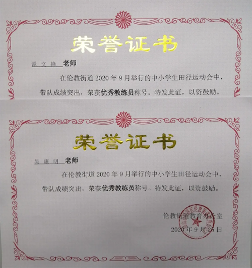 2020年9月24-25日,2020年伦教街道中小学生田径运动会在汇贤实验学校拉开帷幕。为打造阳光体育,培养阳光学生,永丰小学田径队积极备战,并在此次运动会上取得小学组团体总分第七名的好成绩,吴康明主任和谭文锋老师获得优秀教练员称号。