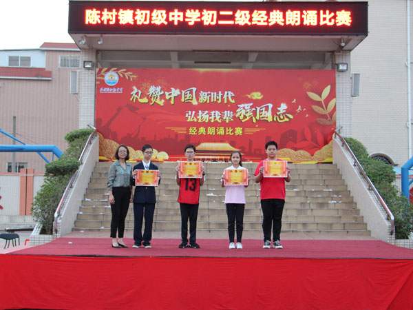 2020年,是全面建成小康社会的决胜之年,是夺取新时代中国特色社会主义伟大胜利的关键之年,是中国现代化强国征途的启航之年。为实现“立德树人”教育目标,培养德智体美全面发展的新时代中国社会主义建设者和接班人,弘扬学生的“爱国心,报国情,强国志”,丰富校园文化生活,打造书香校园。陈村镇初级中学初二级于2020年11月5日下午,在学校操场举办了“礼赞中国新时代,弘扬我辈强国志”的朗诵比赛。陈村镇初级中学谢文忠校长、专职书记梁兆伦副书记、李日和副校长、汪立云副校长、教务处杨丽桃主任、总务处林鹏副主任出席了本次比赛活动。初二级全体语文老师担任评委。