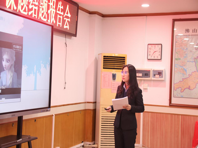 首先举行的是由伍秋燕老师主持的顺德区小课题“趣配音APP在初中英语教学中的应用研究”的结题汇报。伍老师从课题背景和意义、研究方法和过程、研究成果、反思和改进等方面做了详尽的汇报,通过学生的视频配音作品向大家展示了课题组开发的一系列成果。