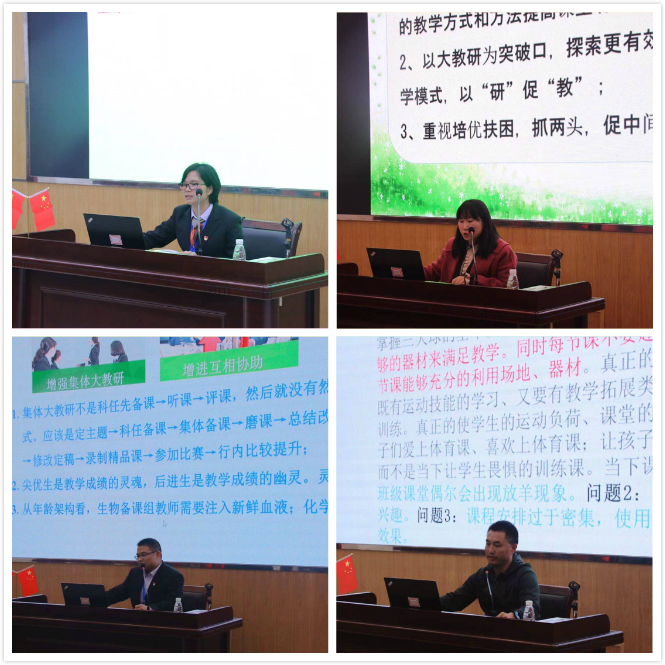 随后,各科组长逐一上台汇报,针对本学期科组的教研工作进行了全面的梳理。同时围绕一学期来科组开展的教学常规、教学研究、科组活动、竞赛辅导等各项工作存在的不足以及解决措施进行了深入浅出的总结说明。各科组的总结说明,理清了工作思路,明确了今后工作的重点,为学校下学期教育教学及科组工作的开展、教学质量的提升奠定了坚实的基础。