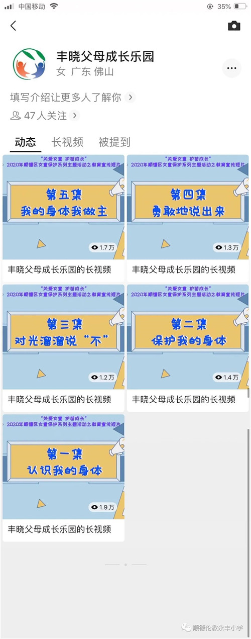 为了拓宽丰晓父母成长乐园的网络学习平台,丰富家长们的学习课程,2020年底,永丰小学成立了动漫制作小组,在丰晓父母成长乐园的网络学习平台“微丰堂”上创立“微动漫”项目,尝试采用动漫的形式向家长们进行家庭教育知识的宣传。在顺德区妇联、顺德区家庭教育联合会的指导下,动漫小组制作了五期女童防性侵的家庭教育系列小动漫,视频发布后,受到了家长们的好评,点击率最高达到了1.9万!