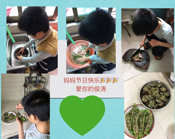 亲爱的妈妈,平时您做家务挺累的,今天好好休息休息一下,让我为您分担一点家务吧 !
