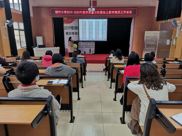 4月2日,勒竹小学里花红树碧,一片春意盎然,而此刻电教室里灯火通明,勒竹小学正在召开针对新型冠状病毒肺炎疫情防控期间线上教学工作的推进会。会议由姚永红副校长主持,苏振国校长、教务处正副主任和各位教师参加会议。