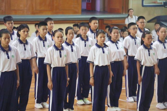 汇操正式开始,十个班的同学们身穿整洁校服,精神抖擞,喊着响亮的口号、踏着整齐划一的步伐依次上场展示。在体育老师的带领下,娴熟从容地展示了立正、稍息、停止间转法和齐步走等动作,赢得在场领导、老师们的阵阵掌声。全体七年级新生在紧张、有序、和谐的气氛中接受了入学后第一次身体上的锤炼和精神上的洗礼。