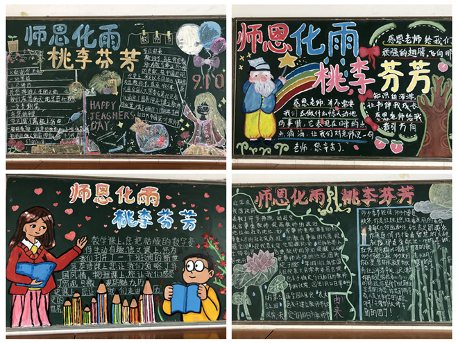 周一下午,全校开展了“师恩化雨,桃李芬芳”教师节主题班会,同学们也用心绘制了精美的主题黑板报,感恩老师,伴我成长!在本节班会课上各班学生都用了不同的方式来表达对老师的感恩之情。这是在教师节来临之际,江义中学学子给矛老师们的最好的礼物。老师们都大受感动。通过此次班会增强了师生间的情感,拉近了师生之间的心理距离。