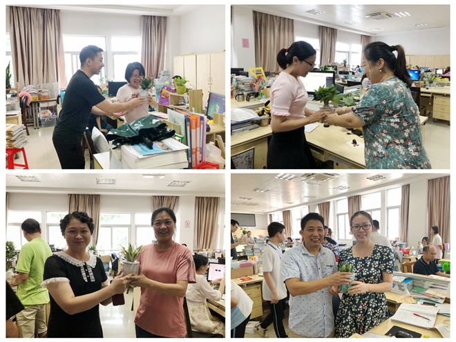在这个特殊的日子里,江义中学工会和团总支为全体教师精心准备了一份教师节小心意――精致的绿植盆栽,由胡和秋校长、刘启文副书记、周霞副校长、梁凯奇副校长、段永辉副校长以及学生代表给办公室每位老师献上绿植,感谢老师们的辛勤付出!