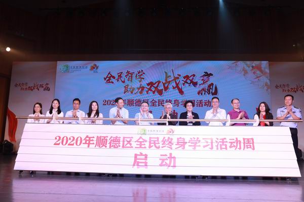 11月7日,2020年顺德区全民终身学习活动周在顺德演艺中心音乐厅拉开帷幕。本次活动周以“全民智学,助力双战双赢”为主题,由顺德区社区教育工作指导委员会主办,顺德区教育局、顺德区大良街道办事处、顺德区文化艺术发展中心、顺德区社区学院承办。广东省教育厅职业教育与终身教育处副处长王魏锋,佛山市社区教育指导委员会办公室主任、佛山市教育局副局长徐旭雁,佛山市社区教育指导委员会办公室常务副主任、佛山开放大学校长伍少德,顺德区委区政府办公室副主任梁嘉斌,顺德区社区教育工作指导委员会办公室主任、区教育局副局长罗劲柏,顺德区大良街道党工委委员梁锦棠,顺德区社区教育工作指导委员会成员单位代表,区、镇(街道)相关部门负责人,区、镇(街道)社区学院负责人以及市民代表共600多人参加活动。现场设有社区教育成果展和社区教育活动体验区,集中展示了顺德社区教育特色,黄连广绣、新 咸水歌、金榜牛乳制作、鱼灯升平游、大门龙舟文化、旧寨白眉武术等丰富多彩的教育活动吸引大量市民驻足观看、参与体验。